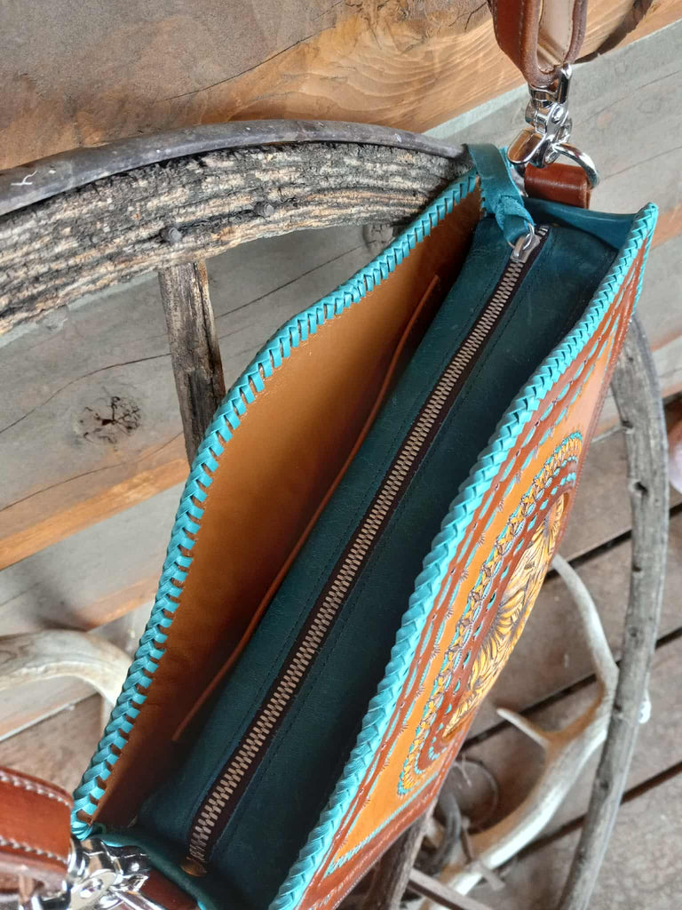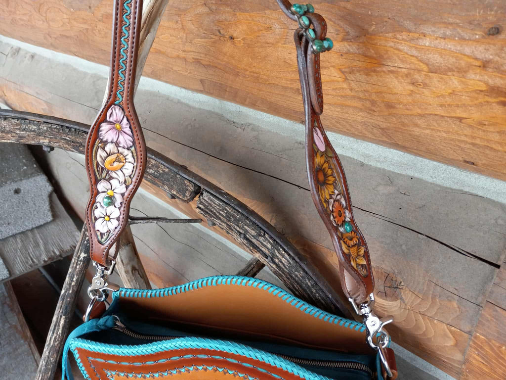 Our premium offering for the fall of 2025! Spring Blossoms features a bouquet of colorful flowers in full color and a cluster of bright yellow sunflowers, both framed by geometric borders and turquoise accents. A full length zippered center compartment keeps all of your valuable secure, with a generous side pocket lining both interior side panels. A matching headstall style shoulder strap completes the look.This stunning bag offers years of good looks and Western style. Measures 11" tall x 12" wide.